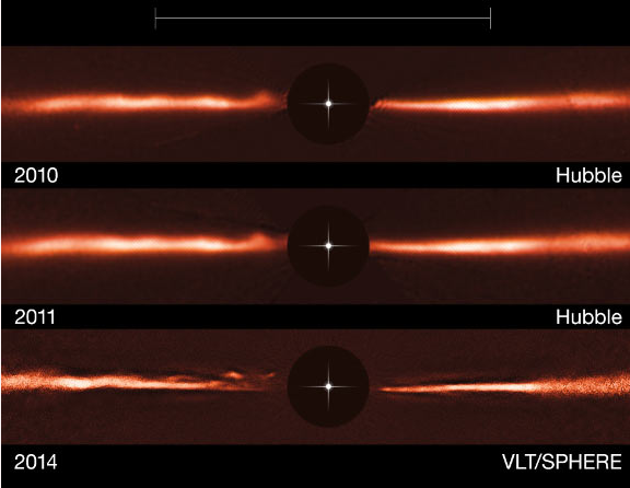 Illustration : en haut et au milieu images de Hubble de 2010 et 2011, rangée du bas :SPHERE en 2014.