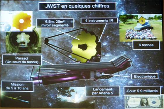 Description de la mission JWST, télescope, instruments associés, difficultés,