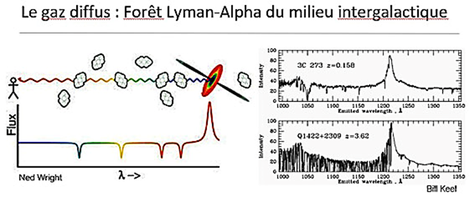 traverse ces nuages de gaz, le spectre de leur lumière va être absorbé par ces