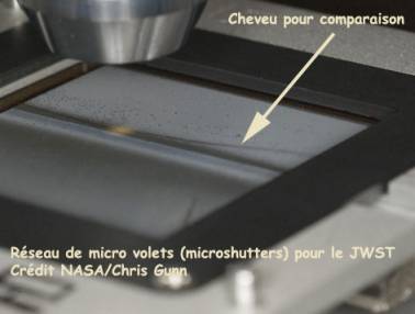 Encore une nouveauté sur le JWST, la technologie des micro volets (microshutters en anglais) qui sont de très fines ouvertures de l'épaisseur d'un cheveu qui devraient permettre au télescope de voir des objets à des distances encore jamais atteintes. Le rôle de ces micro volets est de masquer la lumière parasite d'objets non désirés situés au premier plan.