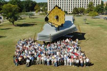 Une partie de l'équipe du JWST devant une maquette à l'échelle 1:1.
