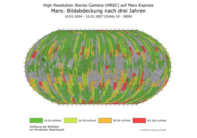 Les bandes de terrains examinées avec différentes résolutions par la HRSC sont identifiées en différentes couleurs allant du vert foncé (la plus forte résolution, couvrant un tiers du globe) au rouge.