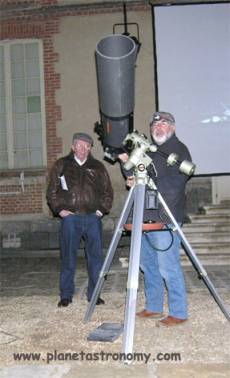 Puis notre ami Daniel Magarian de VEGA (photo de droite avec lampe sur la tête, à ses côtés H Demython aussi de VEGA l'Association d'Astronomie de Plaisir) grâce à son superbe télescope et sa webcam nous a projeté des images du ciel en direct et notamment un superbe Saturne avec Titan.