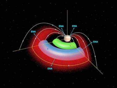Les atomes neutres et énergétiques (marqués ENA) sont émis par le tore d'Europe à cause de l'interaction entre les ions et le gaz neutre. (découverte de Cassini grâce au Mimi : Magnetospheric Imaging Instrument).