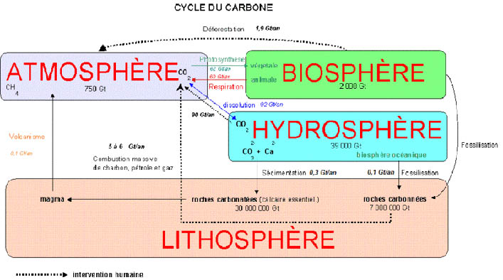 Le cycle du carbone fait intervenir les échanges entre la matière vivante, les océans, l'atmosphère et les roches.