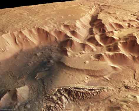 Vue en perspective de la vallée menant au delta pris par la HRSC. Vallée de 30km de long et profonde de 1000m.