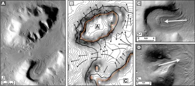 D'après James Dickson le responsable de cette étude, on a détecté dans la région du Protonilus Mensae Coloe Fossae des reliefs typiques correspondant aux paysages de glaciers terrestres : des moraines, comme on peut le voir sur cette illustration tirée d'articles de ces chercheurs de la Brown University.