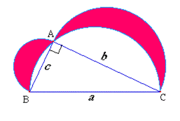 Dans ses recherches sur la quadrature Hippocrate trouva l’aire des lunules ( surfaces partielles de cercles ( croissants ) ) – la somme des aires des lunules est égale à l’aire du triangle rectangle sous jacent- et il inventa l’intégration des surfaces qui sera reprise 21