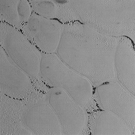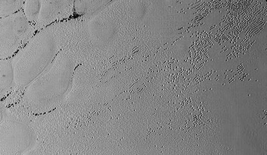 On voit ici dans la région Sputnik Planum, des rangées de trous imprimés dans la glace dont l’origine est inconnue.