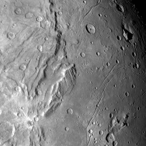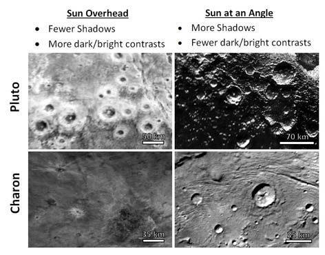 New Horizons est passé très rapidement (quelques heures), si bien que les conditions d’illumination sont similaires pour les zones situées sous la même latitude : celles du Nord ont le Soleil directement au dessus, celles plus équatoriales ne reçoivent le Soleil qu’en mode rasant. Cela a pour effet de rendre les cratères septentrionaux plus plats alors que les méridionaux ont l’air beaucoup plus prononcé.