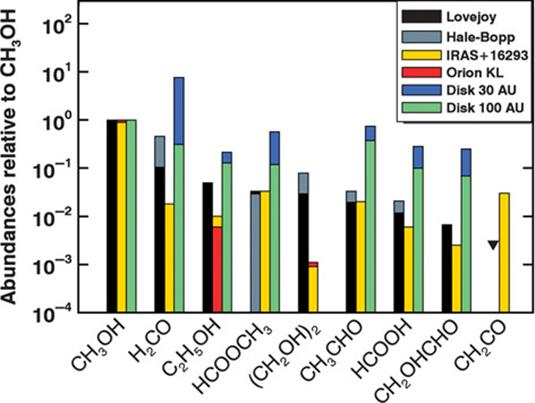 Ces molécules organiques ont une abondance relativement élevée, comparée aux abondances mesurées dans les régions de formation d’étoiles, ce qui est en accord avec une synthèse organique importante dans les régions extérieures de la nébuleuse protoplanétaire.