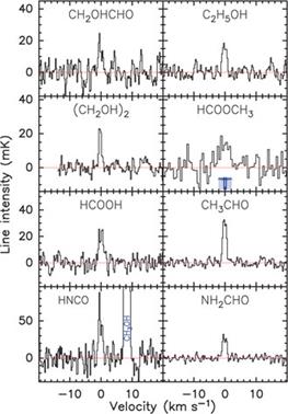 Parmi les autres molécules détectées, plusieurs sont des molécules organiques complexes, comme l’éthylène glycol (utilisé comme antigel), le formiate de méthyle, l’acétaldéhyde (ou éthanal), la formamide, l’acide formique, et le formaldéhyde.