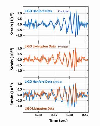LIGO a détecté les ondes lorsque leur fréquence atteignit 35Hz, fréquence qui allait vite augmenter jusqu’à 250Hz puis disparaitre. Tout s’était passé en un quart de seconde. Hanford le vit 7ms plus tard, c’est apparemment le temps de propagation des ondes à travers la Terre.