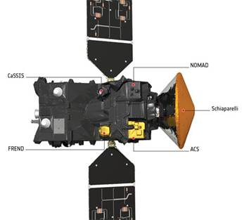 orbiteur TGO (Trace Gas Orbiteur) et un mini atterrisseur EDM (Entry, Descent and Landing Module) surnommé Schiaparelli, en 2016 (Exomars 2016) et