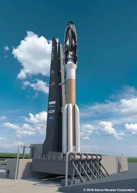 Illustration : dessin d’artiste de Dream Chaser dans la coiffe de la fusée Atlas.