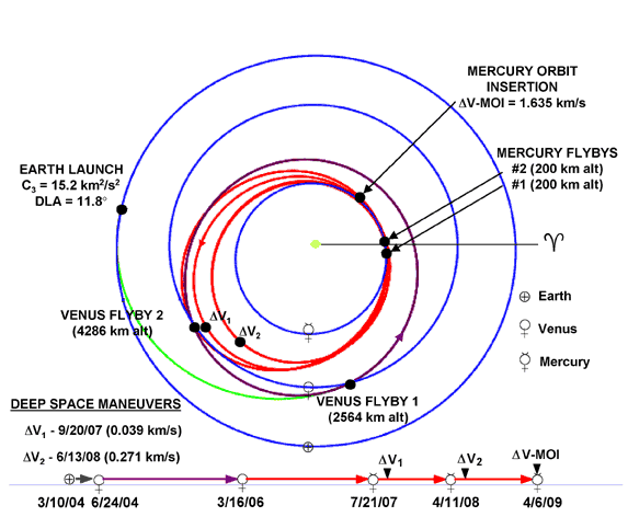 La trajectoire de la sonde est compliquée afin de profiter de l'effet de fronde gravitationnel (gravity assist en anglais) de la Terre de Vénus et de Mercure afin d'arriver en orbite mercurienne vers 2011.