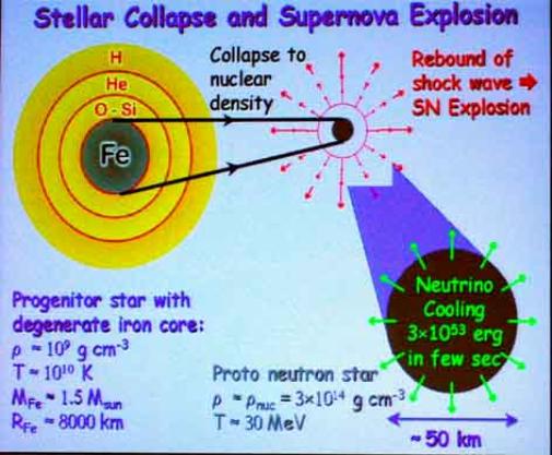 La mort d'une étoile massive, lorsque le cœur de fer s’effondre, le noyau vole en éclats et on a émission de neutrinos, les neutrinos sont les premiers messagers de la mort d'une étoile.