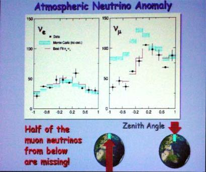 On s'aperçoit que le nombre de neutrinos détectés provenant du "haut" est le nombre attendu (les neutrinos muoniques descendants n'ont pas le temps de se transformer dans un autre type avant d'atteindre le détecteur,), alors que le nombre de neutrinos provenant du "bas" (ayant traversés la Terre et parcourent jusqu'à mille fois plus de chemin, se convertissent vraisemblablement en neutrinos tauiques) est en déficit d'un facteur deux.