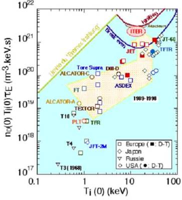 situé à gauche montrant l'évolution des caractéristiques des Tokamak depuis