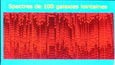 On peut mesurer ces différents z en étudiant d'un coup une centaine de ces sources lumineuses qui sont placées derrière un masque équipé de prismes, afin d'obtenir une centaine de spectres, comme on le voit sur les deux images suivantes.