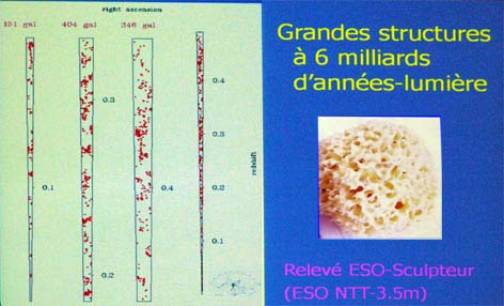 On va ainsi jusqu'à une profondeur de 6 milliards d'années lumière, comme on le voit ici où cette "carotte cosmique" a été partagée en trois.