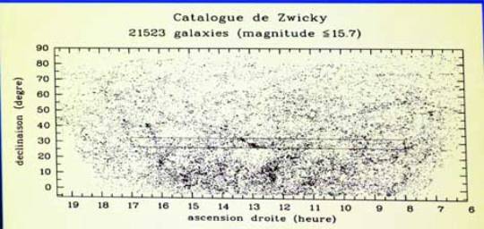 Un des premiers relevés est dû à l'astronome un peu fantasque Fritz Zwicky qui publie la carte de plus de 20.000 galaxies dans les années 1960.