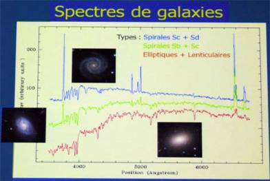 On s'aperçoit aussi que chaque type de galaxie émet plutôt dans une couleur particulière, par exemple les elliptiques et lenticulaires en rouge etc..