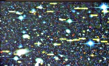 Que remarque-t-on? Aussi loin que l'on regarde, il y a des points lumineux, ce sont des galaxies. (les croix lumineuses sont produites par les étoiles proches situées dans notre propre galaxie).