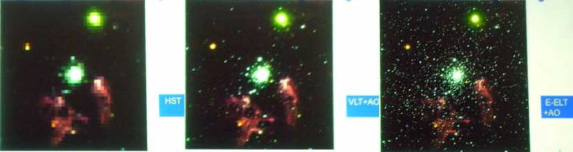 avec l'E-ELT, de g à d : vue par Hubble; vue par le VLT avec OA (optique
