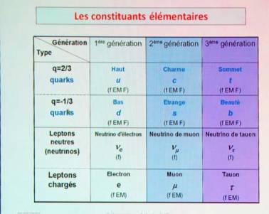 Les particules « élémentaires » du modèle standard, elles sont au nombre de 24 en 3 générations qui ne diffèrent que par la masse (de + en + lourd)