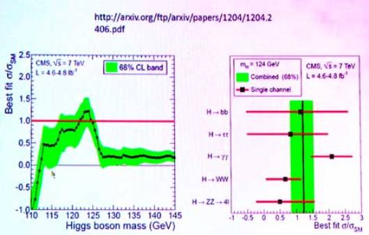 Slide : les premières mesures diffusées par le CERN fin 2011 avec la masse présumée du boson de Higgs (approx 125 Gev).