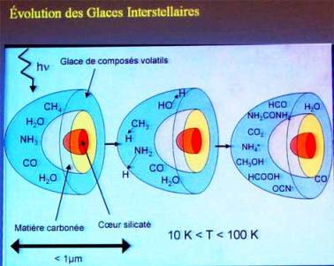 Dans le milieu interstellaire, ils peuvent rencontrer des nuages moléculaires denses (H, O, N, C..) et ils peuvent s’accréter avec eux, puis se combiner entre eux pour produire des molécules plus complexes comme H2O, CO, CO2, CH3OH, NH3… qui vont recouvrir la surface de ces grains en formant des glaces interstellaires « primitives »