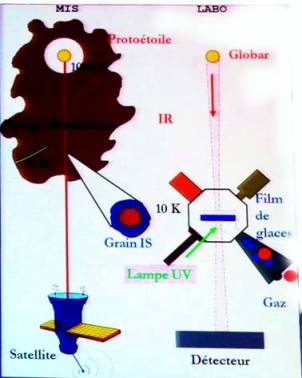 Ces dispositifs font tous appel à une puissante source de rayonnement (lampe UV par exemple) qui est dirigée sur la matière simulant les grains interstellaires.