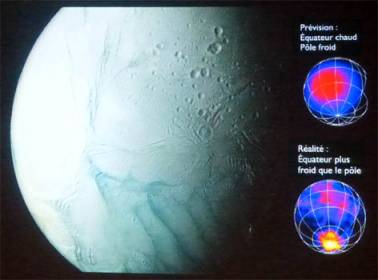 Normalement l’équateur devrait être plus chaud que les pôles, et bien ce n’est pas vrai, sur Encelade, le pôle Sud est plus chaud. Des geysers de matière sont éjectés en permanence au travers de fissures dans la croûte (les fameuses griffures de tigre).