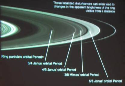 Cela donne lieu comme nous venons de le voir à des résonances, des confinements, des ondes de densité et à des agglomérations de matière appelées hélices (propellers en anglais).