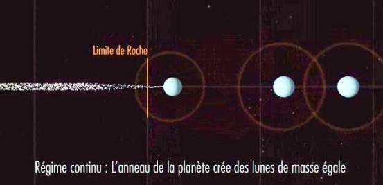 Ce modèle explique la répartition des satellites des planètes gazeuses, ils seraient nés à partir d’anneaux. Même les planètes terrestres auraient possédé dans le passé un anneau qui aurait pu donner naissance à un satellite. (Terre, Pluton).