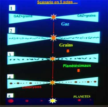 Un disque de gaz et de poussières (grains) est présent autour de l’étoile naissante ; ces grains se condensent en planétésimaux puis en embryons de planètes et enfin quelques uns en planètes.