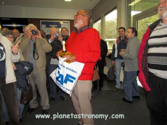 Au nom de la SAF et de VEGA nous offrons au professeur Mayor quelques petits souvenirs à bulles de France, cela semble l’amuser particulièrement !