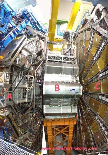 En fait on va donc construire 2 grands détecteurs de collision de technologie différente afin d’être sûr que le boson ne soit pas fabriqué par un détecteur unique. Les différences de technologie porteront sur la production du champ magnétique nécessaire pour piéger les muons. Pour CMS (Solénoïde Compact à Muons) (11.000 tonnes) le champ sera celui d’un solénoïde géant, pour ATLAS le champ sera toroïdal. Il y aura sur l’anneau 2 autres détecteurs : ALICE (collision d’ion de plomb pour étudier le plasma et les gluons du BB) et LHCb pour l’étude de l’antimatière, tous deux de conception française.