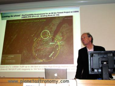 Pourquoi donc des astronomes s’intéressent-ils au boson de Higgs presqu’autant qu’aux anneaux de Saturne ? Cela vient sans doute de notre contemplation du ciel et de la remarque de Leibniz en 1740 contemplant lui aussi notre ciel au temps heureux où les savants étaient d’abord les philosophes : « Pourquoi y a t-il quelque chose plutôt que rien ? ». Le début de la réponse vient de la vitesse limitée de la lumière. Observer le ciel c’est donc observer l’histoire et donc vient l’idée d’un début de cette histoire. Les calculs de l’abbé Lemaître conduisant à l’expansion de l’U et donc son début invite  à découvrir les balbutiements du jeune Univers fait de plasma de gluons et un champ de force peut être unique. Mick Storr, qui va nous accueillir ce soir, me disait en 2010 : »nous travaillons pour vous les astronomes ». Avec le LHC on va recréer les conditions initiales en énergie et température d’une fraction de seconde du BB où les éléments internes des atomes étaient dissociés. L’inflation, confirmée en mars dernier par Planck, va refroidir l’Univers naissant et libérer et composer ces éléments.