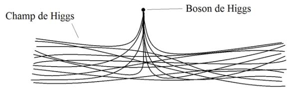 Pour que les bosons W et Z acquièrent de la masse, on va imaginer les mettre dans un champ analogue à une mélasse ou un espace visqueux. La masse, c’est quelque chose qui s’oppose au changement dans le mouvement, une accélération, et pour donner une illusion de masse à une particule, on peut la faire interagir avec ce champ, qui va jouer un rôle analogue à de  la mélasse. En langage de physicien c’est une fluctuation de l’énergie du vide. Dans l’Univers le vide n’est pas totalement vide car il y a toujours des particules résiduelles en mouvement non détectables. Par ailleurs l’état fondamental d’un champ est son état de plus faible énergie. Toute la difficulté, c’est faire en sorte que le champ recherché crée bien une mélasse à basse température, mais pas à haute température. Or la mélasse n’est pas l’état naturel d’un champ. Exemple le champ électromagnétique : si on ne fait rien pour le stimuler ou le créer, il sera nul et ne freinera pas. On dit que l’état fondamental du champ électromagnétique est zéro. Mais avec le champ de Higgs, pour avoir de la mélasse sans rien faire, il nous faut aussi un champ dont l’état fondamental soit non nul. Enfin seulement à basse température, car on ne veut plus de mélasse à haute température. Ce double état changeant s’appelle une brisure de symétrie. Représenté par un chapeau mexicain où les particules du début vont glisser de haut en bas selon la température. La brisure de symétrie se dit aussi « transition de phase », phénomène analogue à l’eau qui passe de liquide en glace ou en vapeur.