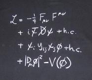 Un Lagrangien (formule d’équations différentielles décrivant des mouvements) englobant les champs décrivant les champs de toutes les particules, le tout en 4 lignes figurant sur les muggs et les T-shirt que vous achèterez au Shop.