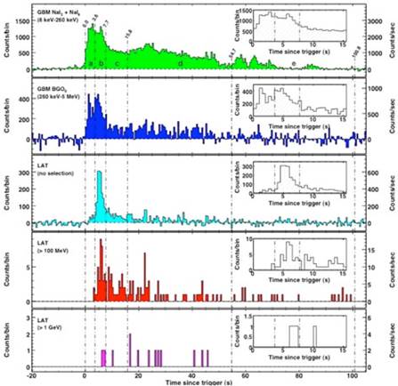 Les deux courbes du haut correspondent à l’instrument GBM (Gamma-ray Burst Monitor) et les trois du bas au LAT (Large Area Telescope) de Fermi.