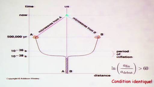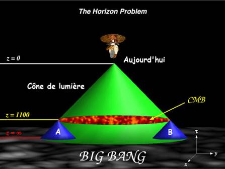 En effet, comment des régions du ciel si distantes entre elles peuvent elles avoir la même température (2,725K), car au moment de l'émission elles étaient d'après la théorie du BB trop éloignées les unes des autres. Sauf si un phénomène exponentiel comme l'inflation ne s'était produit