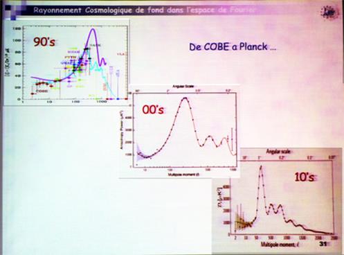 Pour les étudier on va s’intéresser à leur spectre de puissance qui s’est afiné au cours du temps en fonction des différentes missions : COBE, WMAP et enfin Planck comme on le voit sur la représentation ci-contre.