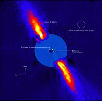 est plus de 1000 fois plus faible que Bêta Pic et est alignée avec le disque.